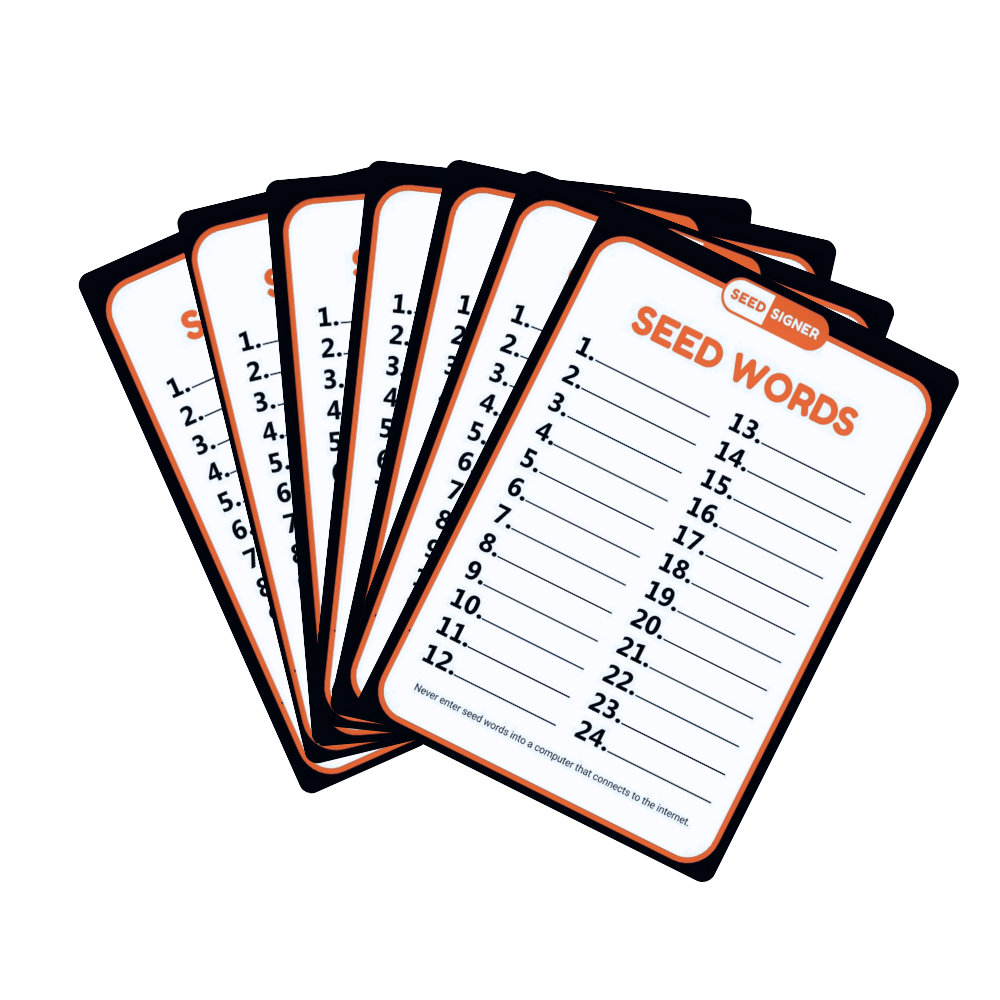 Pack of seven (7) SeedQR cards, 3″ x 4″ dimensions, printed on matte-finish 220GSM thick paper, enough cards for two 2-of-3 or one 3-of-5 multisig